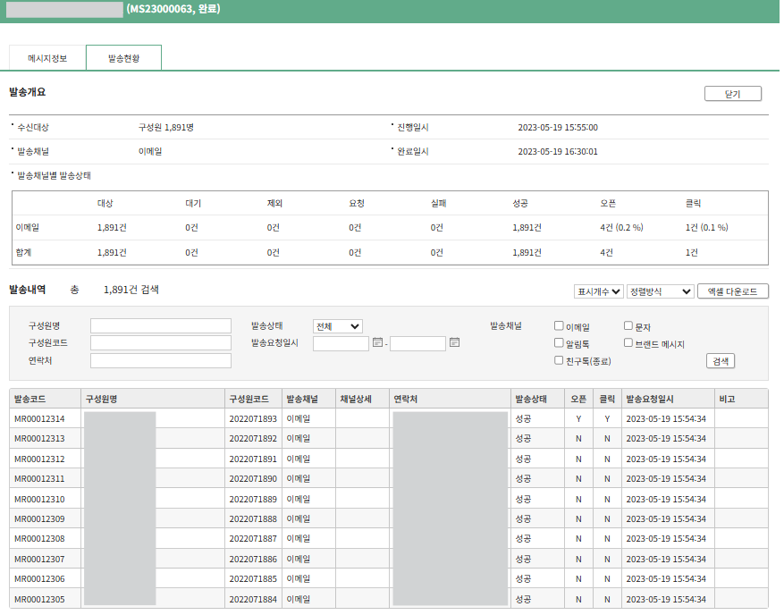 메시지 발송 결과는 어디서 확인하나요? 이재은 2026년 02월 25일 08:51 업데이트 시간 팔로우 메시지 발송 결과는 메시지 등록/조회화면에서 확인할 수 있습니다. 일반메시지/자동메시지 목록에서 조회하려는 메시지를 선택합니다. 발송현황 탭에서 수신자별 발송현황을 조회할 수 있으며, 엑셀로 다운로드할 수 있습니다. 관련 문서 메시지 발송상태의 뜻을 알고 싶습니다. 메시지 발송을 예약할 수 있나요? 자동메시지 발송하기 (1) 자동발송규칙 설정하기 일반메시지와 자동메시지 문자 발송 실패사유별 상세 원인 댓글 댓글 0개 이 문서에는 댓글을 달 수 없습니다.