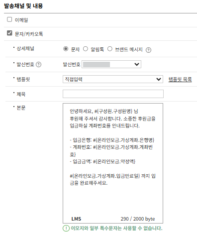 가상계좌로 후원을 신청한 경우, 후원자가 직접 해당 계좌로 입금해야 후원이 완료됩니다. 후원자가 잊지않고 입금할 수 있도록 계좌번호와 후원금액을 메시지로 발송해 후원 성공률을 높일 수 있습니다.
