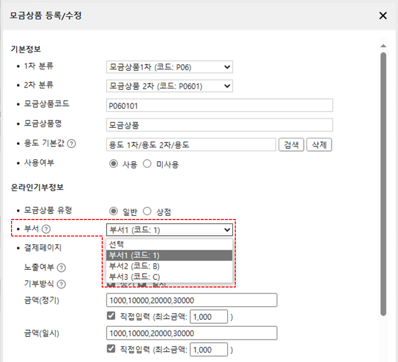 모금상품별 사용할 부서를 설정합니다. 온라인 약정 등록 시 후원자가 선택한 모금상품에 따라 부서가 자동으로 입력됩니다.