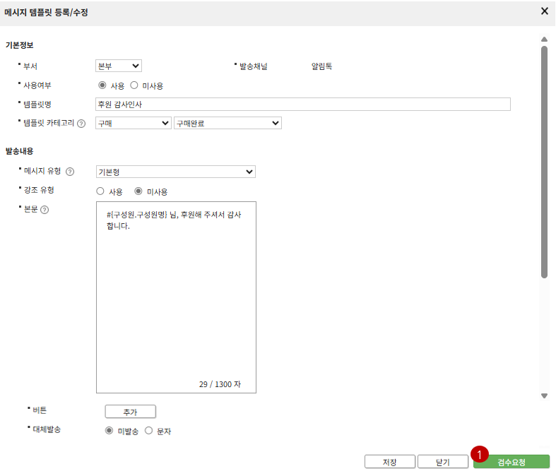 - 작성 후 [검수요청] 버튼을 클릭합니다. 저장만 할 경우, 카카오로 검수 요청이 전달되지 않으니 주의해 주세요.