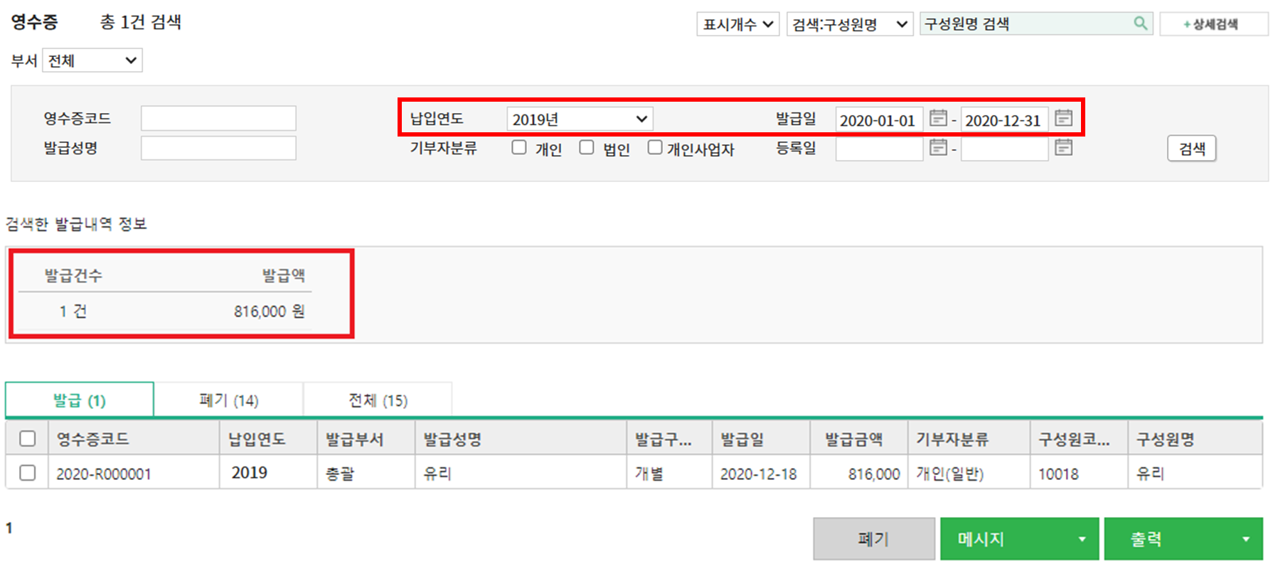 (예: 2019년 납입내역에 대하여 2020.01.02에 영수증을 발급했다면 납입연도는 2019년, 발급일은 2020년이 됩니다. 기관에서 기존에 제출하셨던 기준으로 검색해주시면 됩니다) - 검색조건에 기부자분류: 개인(개인, 개인사업자), 법인을 각각 선택하여 검색합니다.