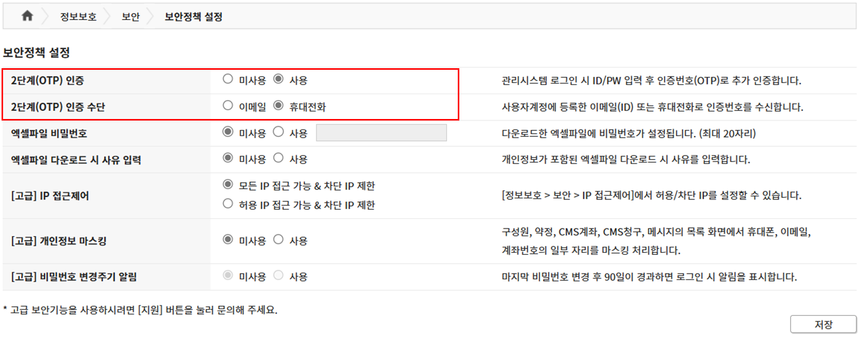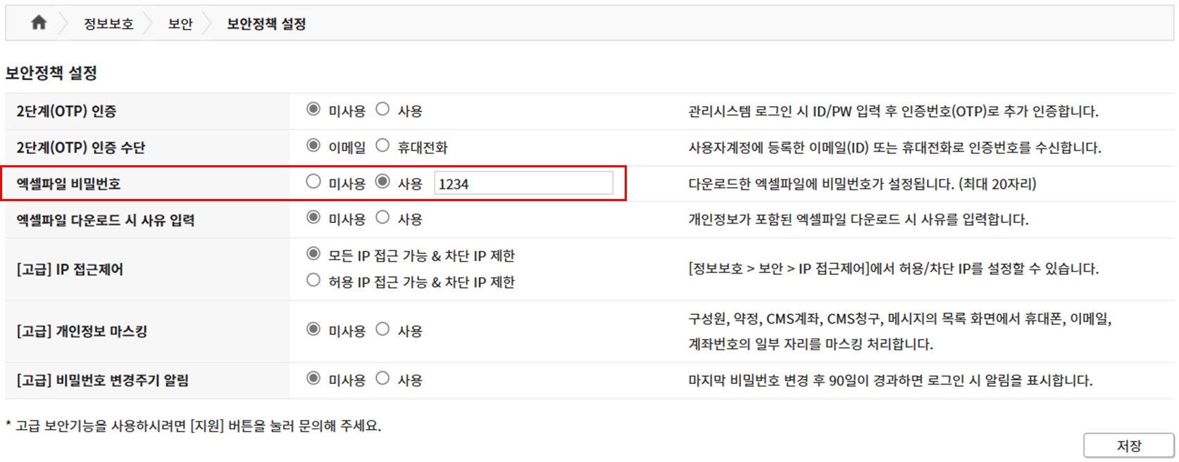 - 메뉴 : [정보보호 > 보안 > 보안정책 설정]