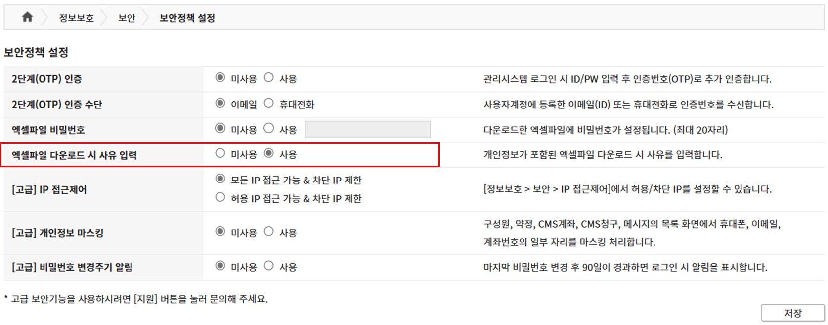 - 설정방법 : 감사 기능 사용하기, 엑셀 다운로드 사유 입력하기