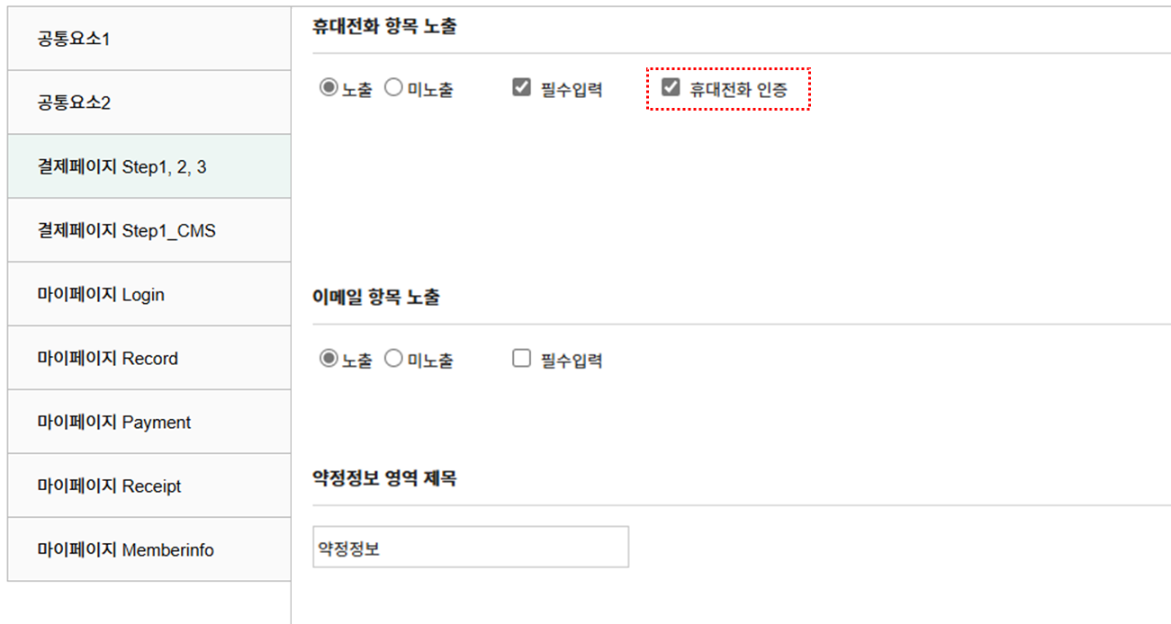 - |step1| 모금상품, 구성원, 약정 영역에서 '휴대전화 항목 노출'의 '휴대전화 인증'을 체크해 저장합니다.