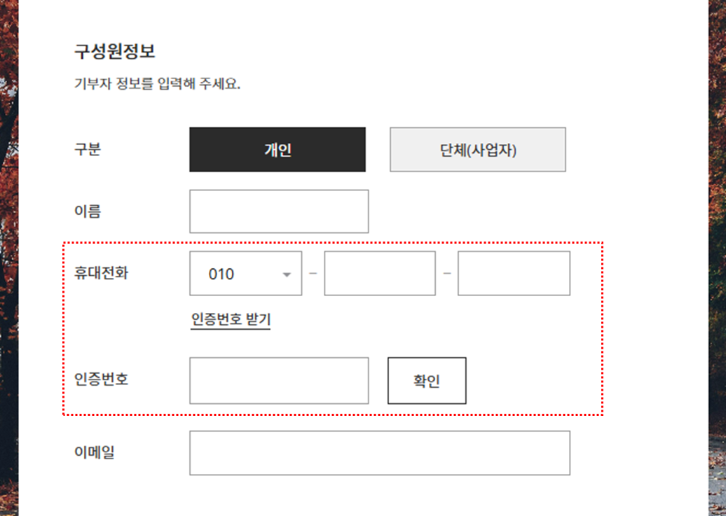 - 휴대전화를 입력한 기부자는 인증을 완료해야만 후원을 신청할 수 있습니다.