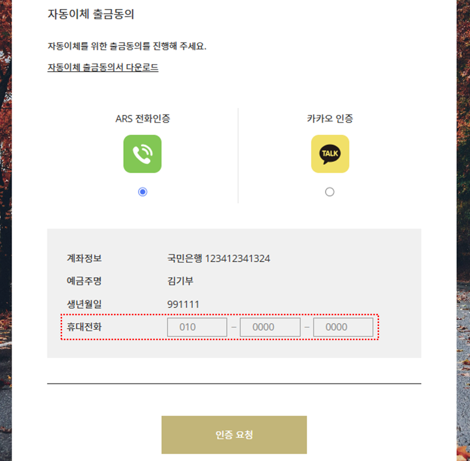 - Step1에서 인증을 완료한 휴대전화로 자동이체 출금동의가 진행됩니다. (결제수단=자동이체인 경우)