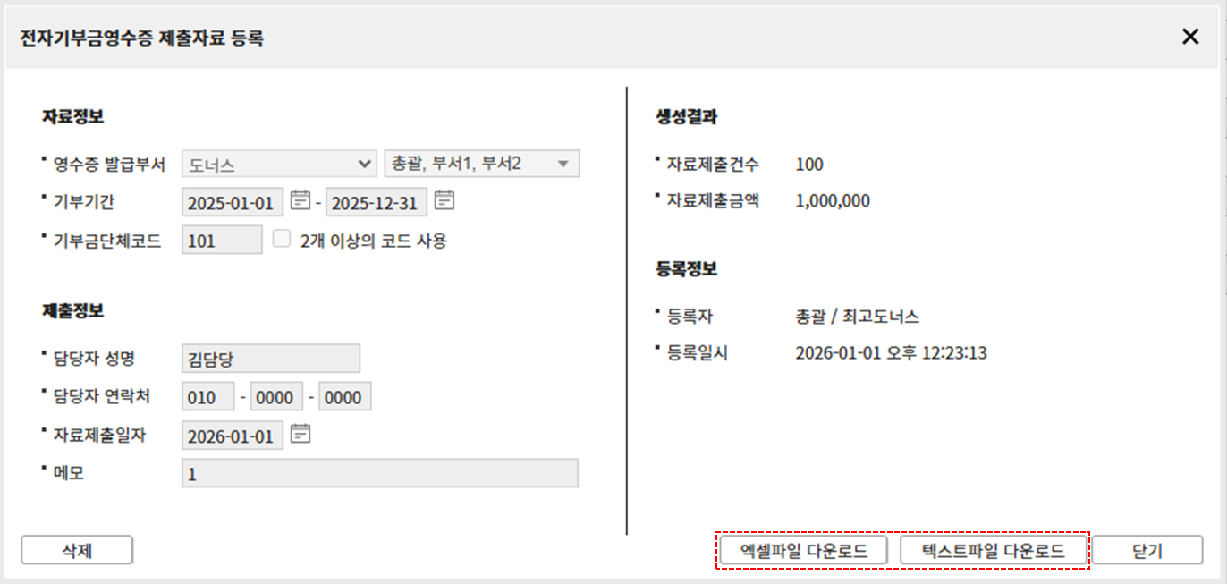 - 기부기간: 전자기부금영수증 자료에 포함할 기간을 입력합니다.