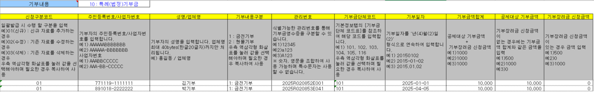 - '전자기부금영수증 제출자료 엑셀파일' 예시 -