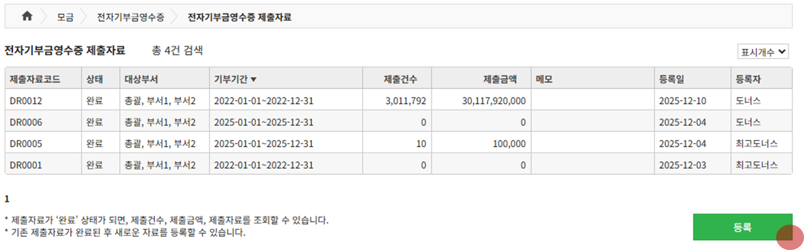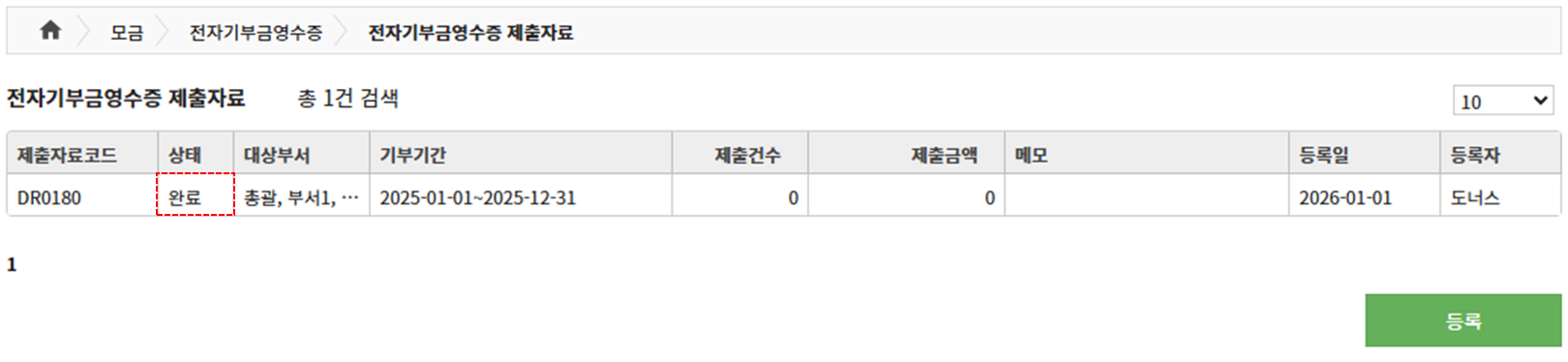 - [모금 > 전자기부금영수증 > 전자기부금영수증 제출자료]에 접속한 후, '등록' 버튼을 클릭합니다.