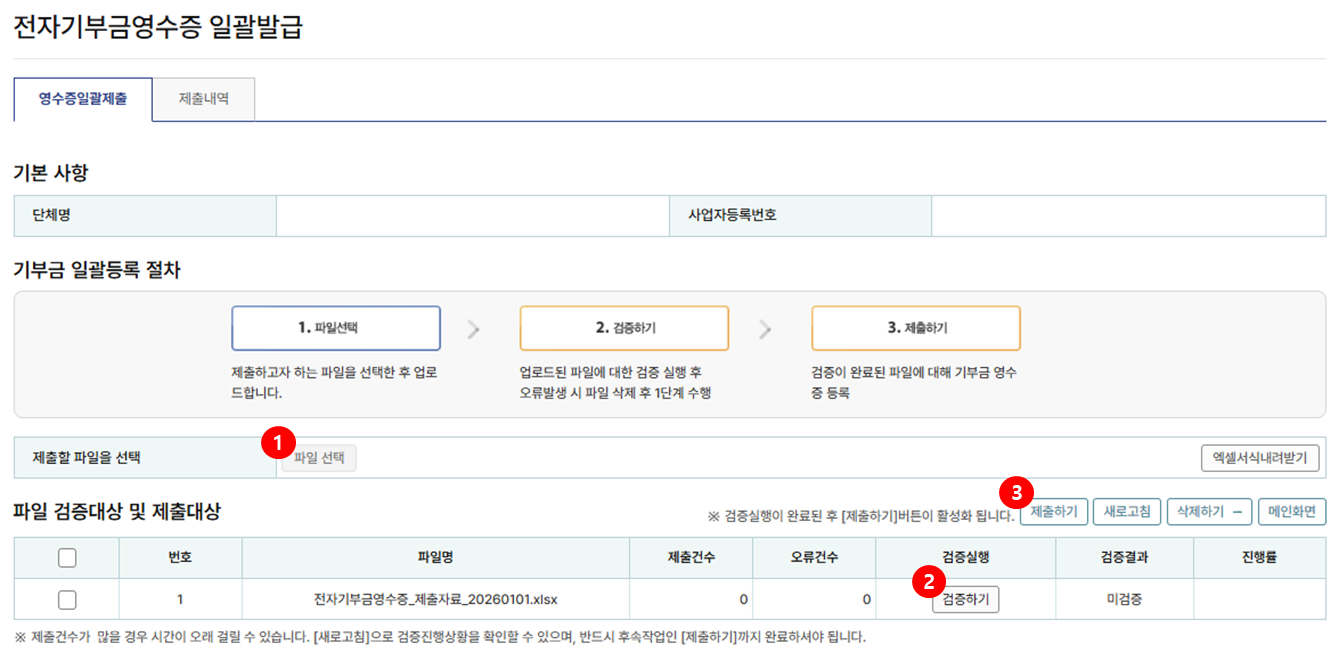 - 전자기부금영수증 일괄발급 파일 업로드 화면 -