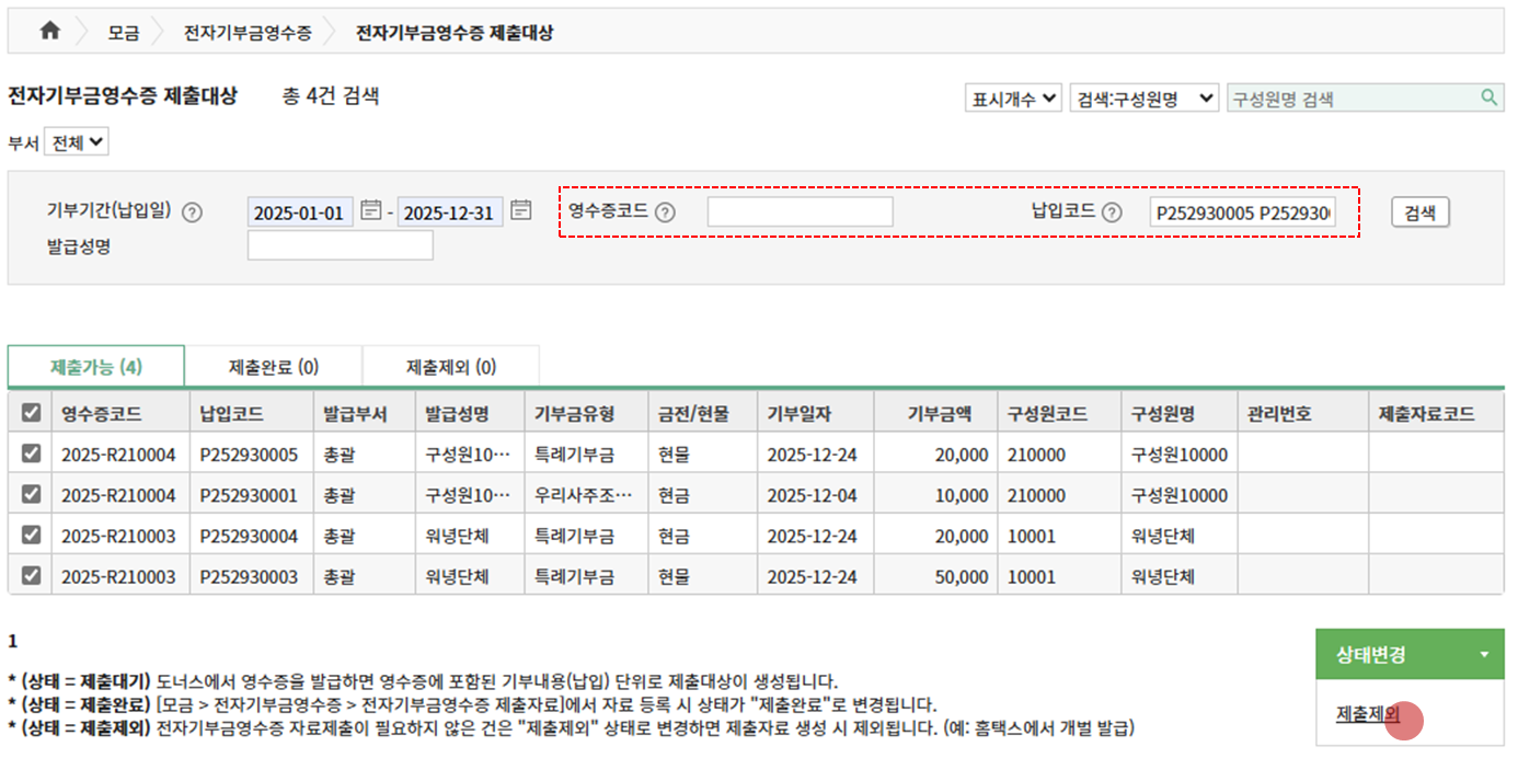 후원자 요청으로 연중 전자기부금영수증을 발급한 건이 있습니다. 제출자료 생성 시 중복이 되나요? 중복제출하지 않으려면 어떻게 하나요?