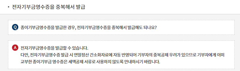 ※ 참고: 국세상담센터 > 자주묻는Q&A: 전자기부금영수증을 중복해서 발급