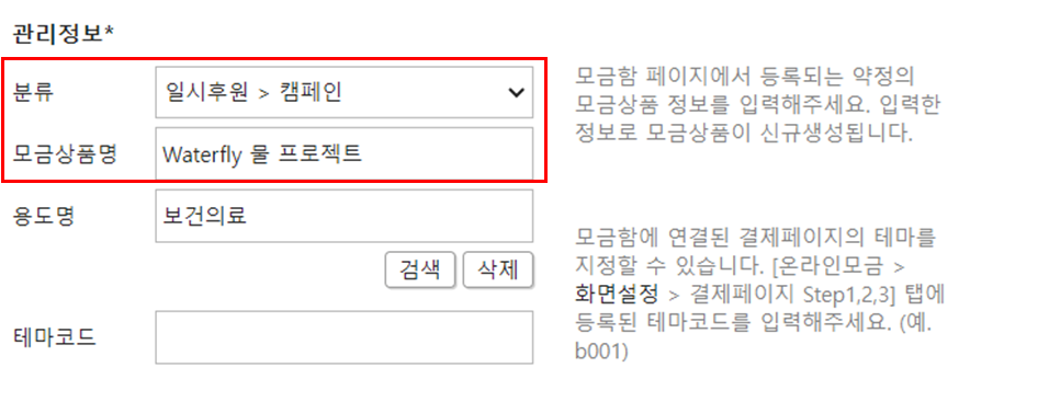 - 모금함 설정 시 테마코드를 지정하면 [온라인모금 > 결제페이지 Step1,2,3]에 등록해 놓은 특정 배경이미지와 항목명, 노출여부 등 개별 설정 사항을 적용하여 노출할 수 있습니다.