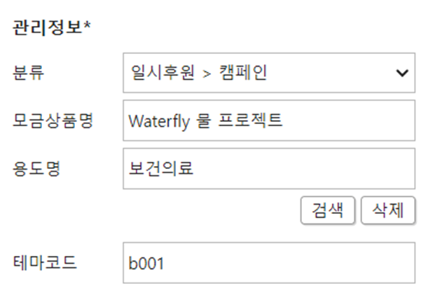 - 모금함으로 유도할 모금상품을 등록합니다. 모금상품명을 입력하면 모금함과 연결될 모금상품이 등록됩니다.