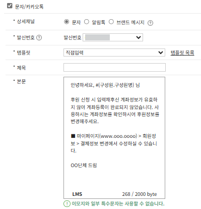 - 발송시간대 : 승인결과는 새벽 3시~오전에 반영됩니다. 발송 시간대를 설정하지 않으면 승인결과가 반영되는 새벽에 메시지가 발송되어 후원자에게 불편함을 줄 수 있습니다. 발송시간대를 적절히 설정해 이용해 주세요.